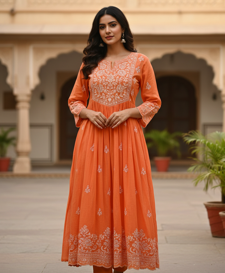 Muslin Silk Long Chikankari Kurti