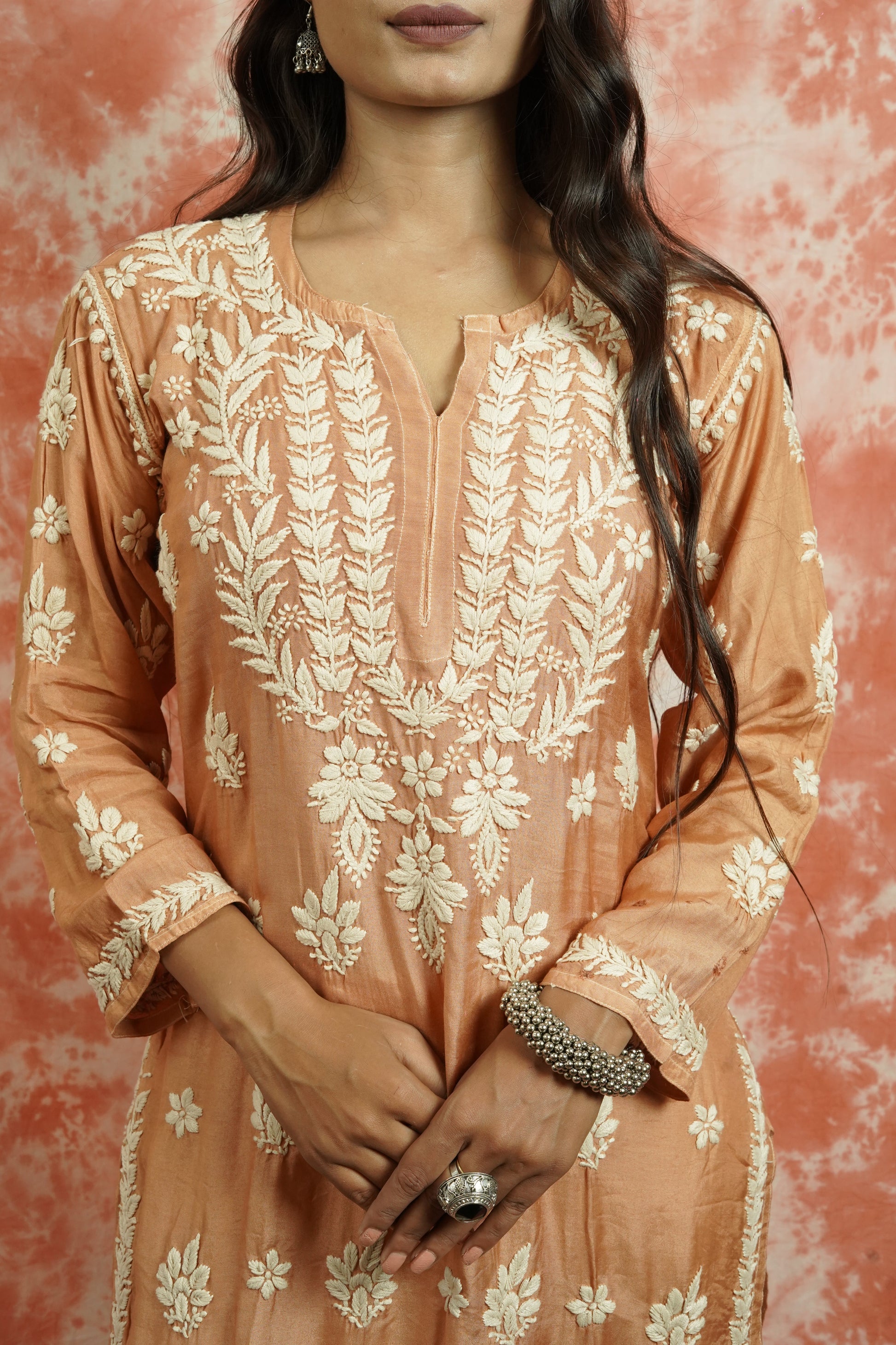 • Embroidery: Hand Chikankari (Ghaas Patti, Bakhiya, Phanda & Pechni stitches)